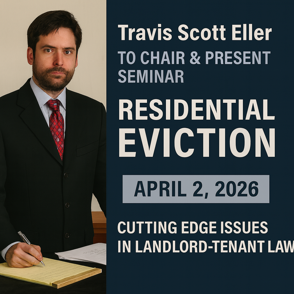 Travis Scott Eller will chair and present at a seminar entitled “Residential Eviction” on April 2, 2026. The Seminar Group, an accredited sponsor with the Washington State Bar, sponsors the seminar. The seminar is pending approval for continuing legal education credit with the Washington State Bar and for real estate clock hours with the Department of Licensing. Mr. Eller’s topic is “Cutting Edge Issues in Landlord-Tenant Law.”